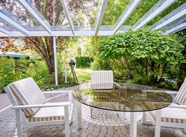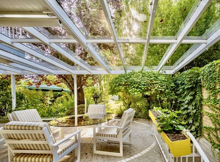 Hier erwartet Sie ein großzügiges Wohnzimmer mit weitläufigen Fensterfronten und direktem Zugang zur herrlichen Terrasse. Diese ist mit einer Glasüberdachung versehen und lädt zum Verweilen bei jedem Wetter ein. Außerdem finden sich im Erdgeschoss eine Küche (mit Erweiterungsmöglichkeit), ein Essbereich, ein gemütlicher Kamin sowie zwei Gäste-WCs.