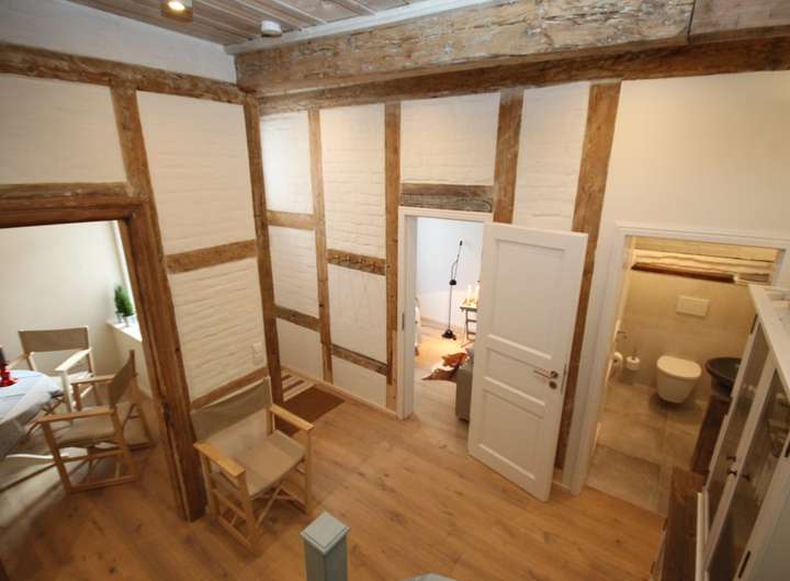 Durch den jetzigen Eigentümer wurde 2015 mit der behutsamen und original getreuen Sanierung, unter Berücksichtigung auch sensibler Denkmalschutz-Auflagen, begonnen. Welche nunmehr vor Kurzem abgeschlossen wurde. Hierbei wurden viele Bauteile, wie zum Beispiel die ca. 550 Jahre alten Deckenbalken, ebenso die teilweise vorhandenen Dielen im ersten Obergeschoss, welche von unten auch als Decke zu sehen sind, erhalten. Das Besondere an diesem Objekt ist die ruhige Lage am Ende eines Ganges, mit einem öffentlichen Teil, welcher durchaus von den Bewohnern als Platz zum Verweilen mit Bänken und Tischen genutzt werden kann. Sie betreten das Erdgeschoss durch die restaurierte Trense, welche sich durch eine großzügige Deckenhöhe auszeichnet. Im linken hinteren Bereich der ehemaligen Feuerstelle wurde jetzt das Gäste-WC untergebracht. Gleich links daneben befindet sich das gemütliche Wohnzimmer. In der Dornse selbst befindet sich die Einbauküche, rechts daneben das gemütliche Esszimmer mit tollem Blick in den Gang entlang bis zur Obertrave. Über die liebevoll restaurierte hunderte Jahre alte Treppe gelangen Sie in das erste Obergeschoss, wobei immer darauf hinzuweisen ist, dass der Kopf eingezogen werden sollte, da teilweise die Deckenhöhen nicht den heutigen Normen entsprechen. Im ersten Obergeschoss finden Sie ein modernes Vollbad mit großzügiger Dusche, Badewanne, Doppelwaschbecken und Fußbodenheizung. Am kleinen Einbauschrank vorbei gelangen Sie in das Schlafzimmer, von welchem aus noch ein kleiner Spitzboden über eine Leiter zu erreichen ist, welcher als Not-Schlafplatz oder zum Abstellen genutzt werden kann. Dieses Ganghaus zeichnet sich außerordentlich durch die gute Belichtung (Ausrichtung nach Süden) und durch die vielen kleinen Fenster und den damit verbundenen Lichtachsen aus. Über den Gang finden Sie in dem zum Objekt gehörenden Abstellschuppen. Hier eine moderne Waschmaschine und einen Trockner vorhanden.