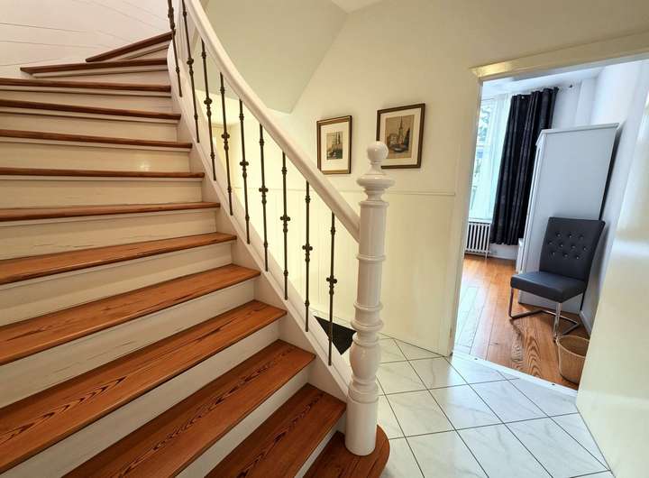 Das gesamte Grundstück präsentiert sich in einem äußerst gepflegten und sauberen Zustand. Das Wohnhaus überzeugt durch seine praktische Raumaufteilung und bietet auch größeren Familien reichlich Platz. Besonders hervorzuheben sind die hohen Decken, der originale Dielenboden, dekorativer Stuck sowie zahlreiche weitere historische Details. Der Keller ist trocken und frei von Feuchtigkeit.