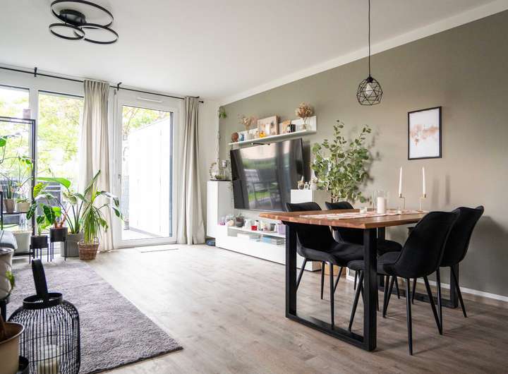 Das lichtdurchflutete Wohnzimmer mit direktem Zugang zur Terrasse schafft einen einladenden Mittelpunkt für die ganze Familie. Die moderne Küche mit hochwertiger Einbauküche bietet viel Platz zum Kochen und Genießen. Ein Gäste-WC rundet das Raumangebot auf dieser Ebene ab.
