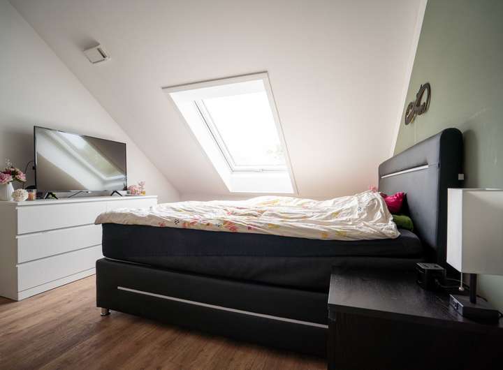 Das großzügige Schlafzimmer überzeugt mit einer angenehmen Raumhöhe von bis zu drei Metern und einem durchdachten Grundriss. Angrenzend befindet sich ein modernes Masterbad mit Badewanne sowie eine begehbare Ankleide. Ein großer Abstellraum ergänzt diese Etage ideal.