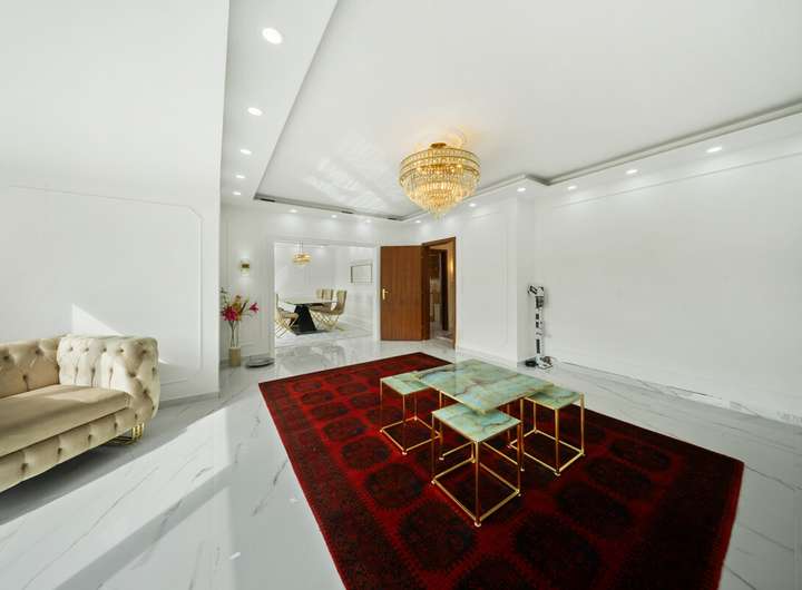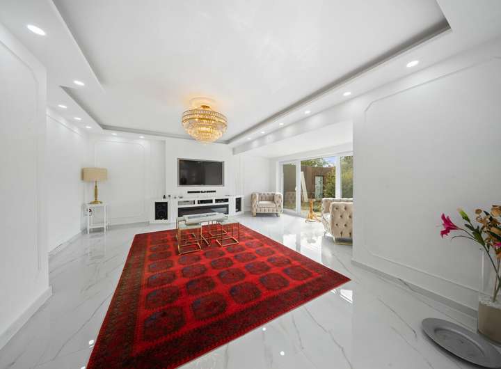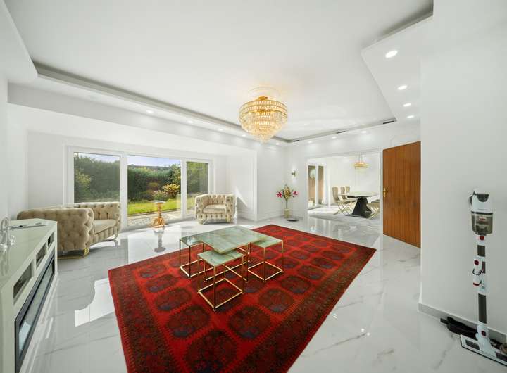 Das Wohnzimmer besticht durch ein durchdachtes Lichtkonzept inkl. indirekter LED-Beleuchtung und einem elektrischen Kamin für gemütliche Abendstunden.