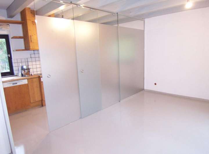 In der Küche werden noch Glaswände eingezogen, die je nach Wunsch offen sein können oder den Essbereich von der Küche abtrennen. Die Wände können dann weggeschoben werden in der Deckenschiene.