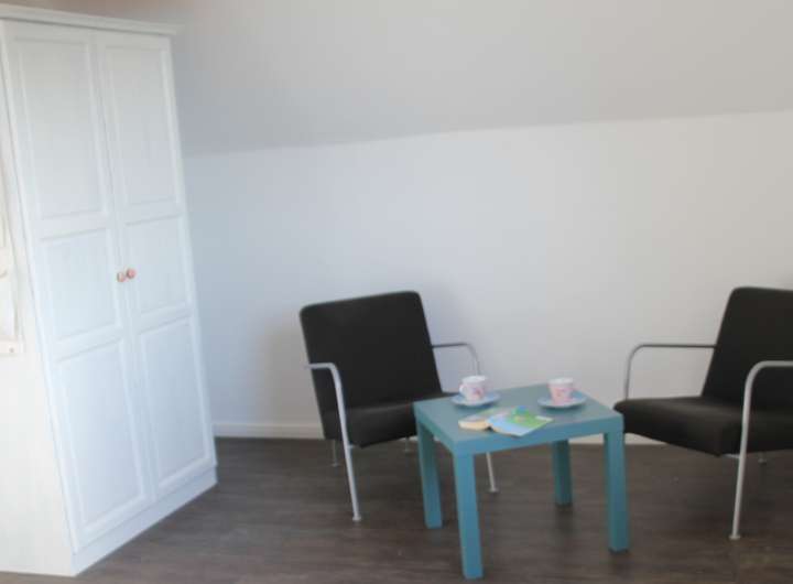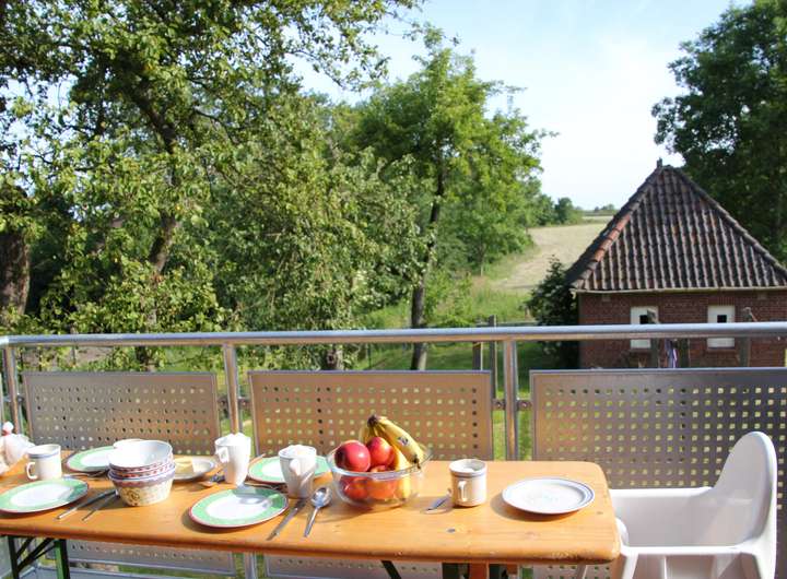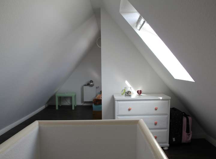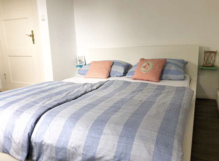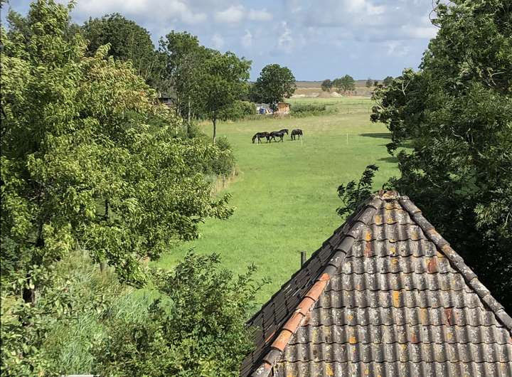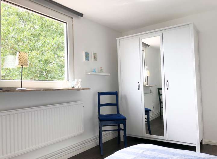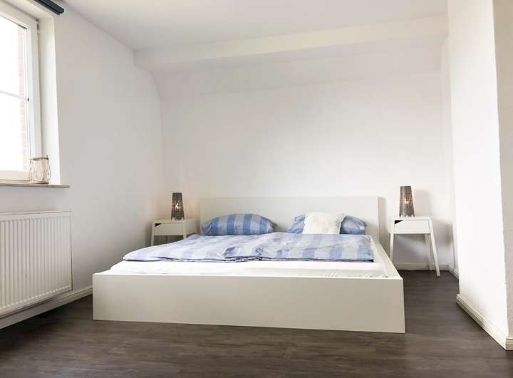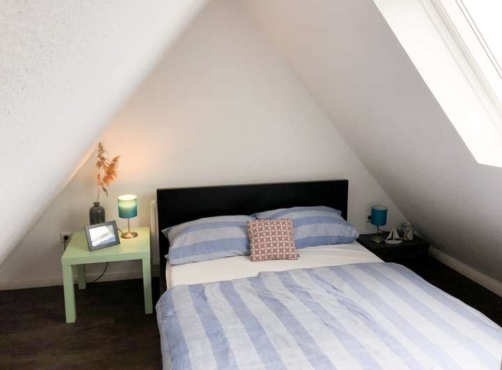 Zwei Schlafräume und das großzügige Bad (mit Doppelwaschtisch, Dusche und Waschmaschine) sind im Obergeschoss zu finden. Das Dachgeschoss dient als weiterer Schlafraum. Von hier reicht der weite Blick über die Felder bis zu den Inseln Norderney und Baltrum. Alle Schlafräume sind mit Doppelbetten ausgestattet.