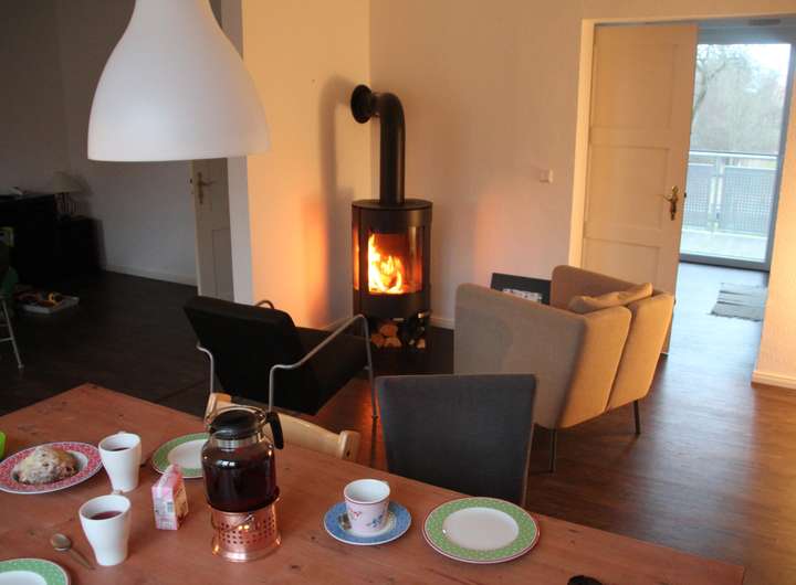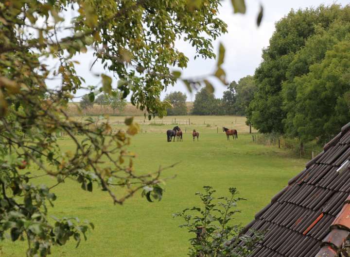 Kamin im Wohnbereich, familienfreundliche Ausstattung (inkl. kindersicherer Steckdosen und Ausblick auf die Pferdekoppel)
