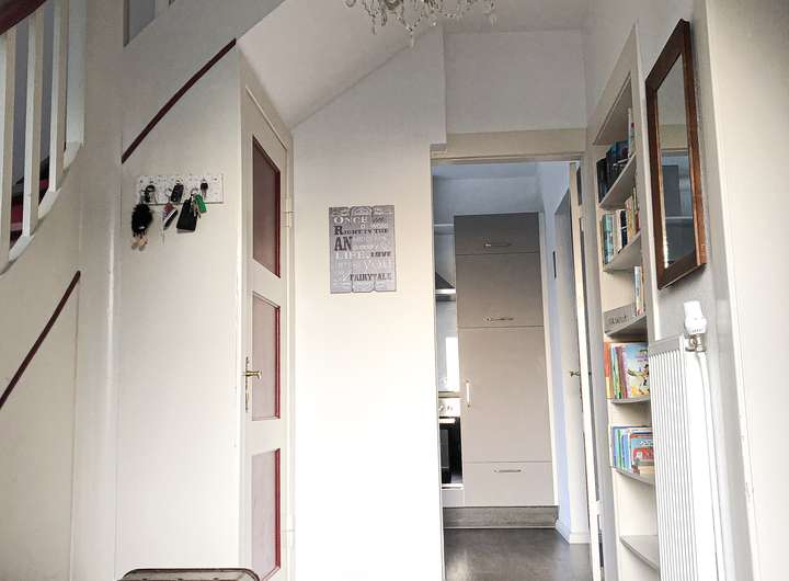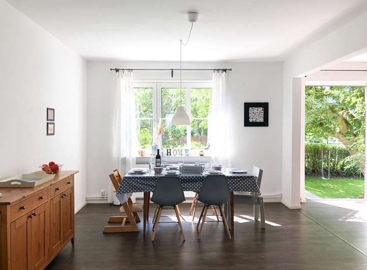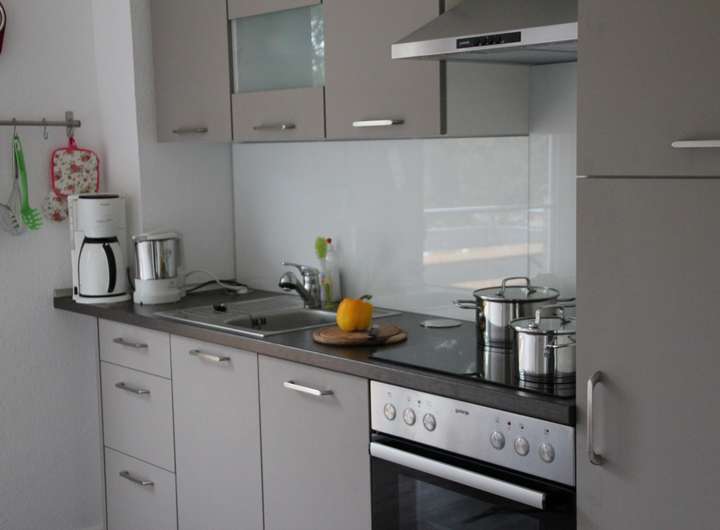 Zimmer: Im Erdgeschoss befinden sich der offene Wohn-, Ess- und Küchenbereich mit Kaminofen und voll ausgestatteter Einbauküche (inklusive Geschirrspüler, Backofen, Mikrowelle), sowie ein Gäste WC und eine lichtdurchflutete Diele mit Platz zum Ankommen.