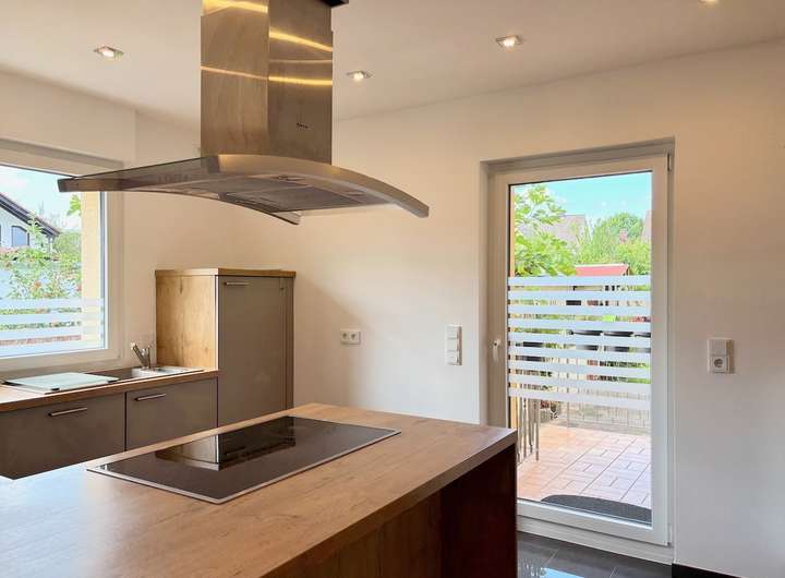 Das Haus erstreckt sich über zwei voll ausgebaute Wohnetagen sowie einen großzügigen Keller. Die Erdgeschosswohnung bietet auf ca. 92 m² drei helle Zimmer – darunter ein einladender Wohn-Essbereich mit großer Fensterfront und direktem Zugang zur sonnigen Terrasse und in den gepflegten Garten. Die offene Küche ist mit einer hochwertigen Einbauküche ausgestattet, ergänzt durch ein großes Schlafzimmer, ein Kinderzimmer und ein geräumiges Tageslichtbad.