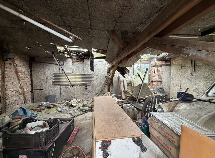 Ein Garagenkomplex ist vorhanden, aber das Dach ist eingestürzt.
