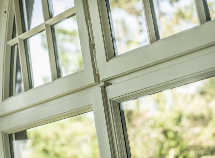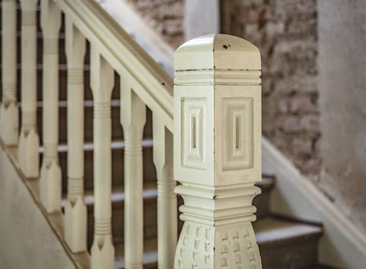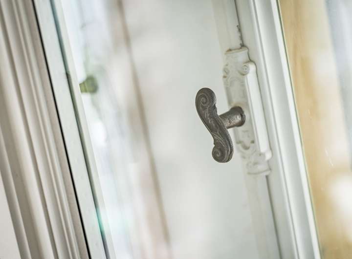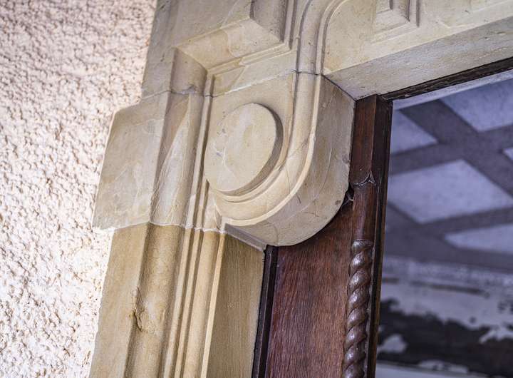 Die Fassade ist in hellem Putz gehalten, wodurch die markanten Fensteröffnungen in den Vordergrund treten. Die Fenster wurden erneuert, hier wurde ein harmonisches Erscheinungsbild in Verbindung mit zeitgemäßer Sicherheitsarchitektur umgesetzt.