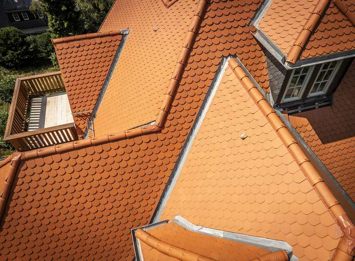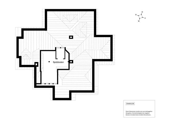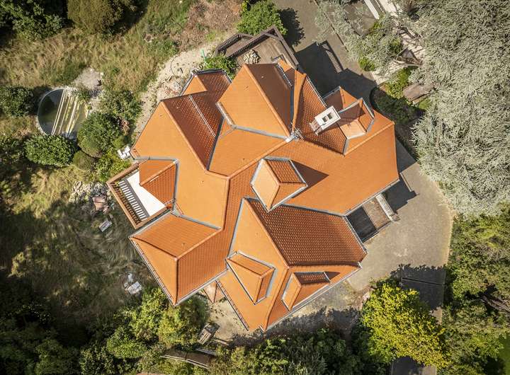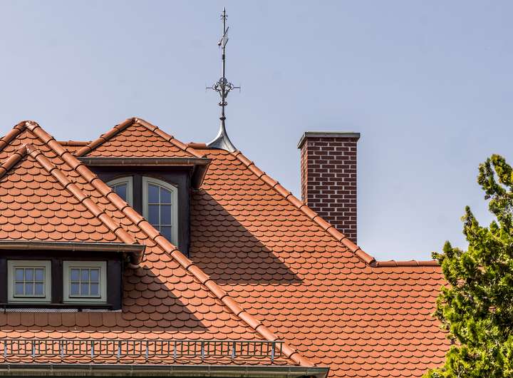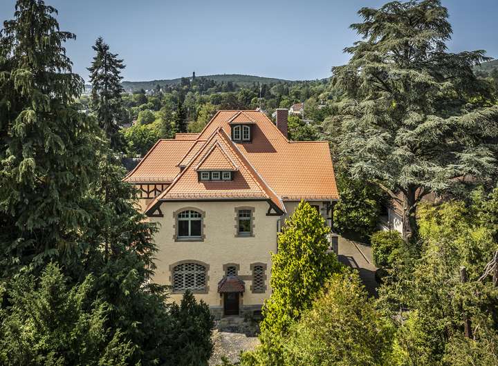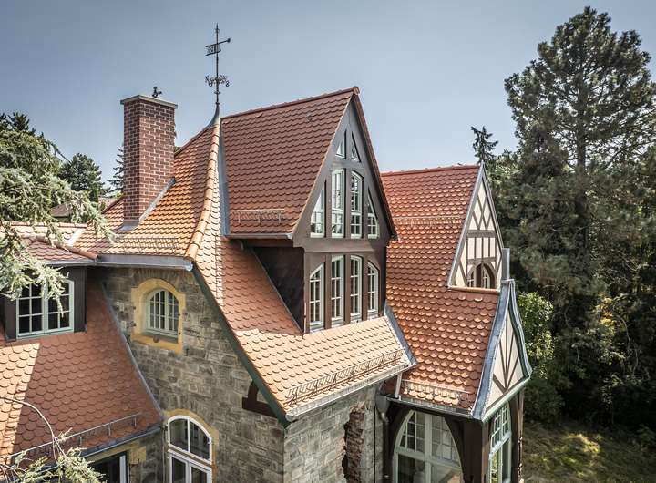 Der Baukörper ist vielschichtig gegliedert, einzelne Gebäudeflügel und Erker treten aus dem Grundvolumen hervor und finden Ihren Abschluss in abwechslungsreichen Dachformen. Die vielfältige Dachlandschaft aus Sattel und Walmdächern verleiht der Villa einen lebendigen und repräsentativen Charakter.