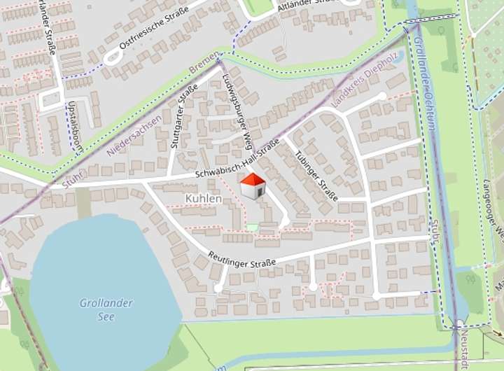 Die Gemeinde Stuhr liegt im Norden des Landkreises Diepholz und hat knapp 34.000 Einwohner. Dieses Reihenmittelhaus befindet sich ganz in der Nähe des Grollander Sees und dem Sportfischerverein Bremen-Stuhr. Alle Geschäfte des täglichen Bedarfs, Ärzte, Apotheken, Restaurants sowie Kindergärten und Schulen befinden sich in unmittelbarer Nähe. Die Anbindung an den öffentlichen Nahverkehr und an die Autobahn ist als sehr gut zu bezeichnen.