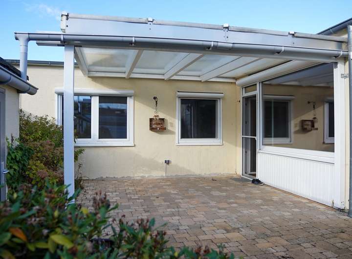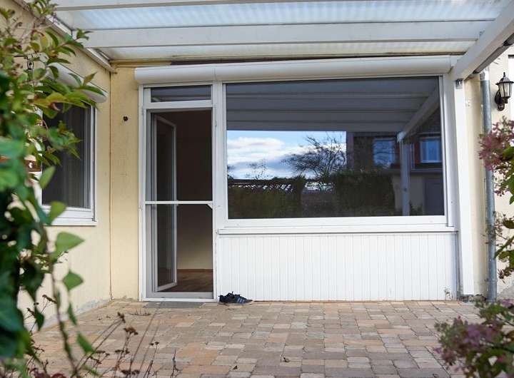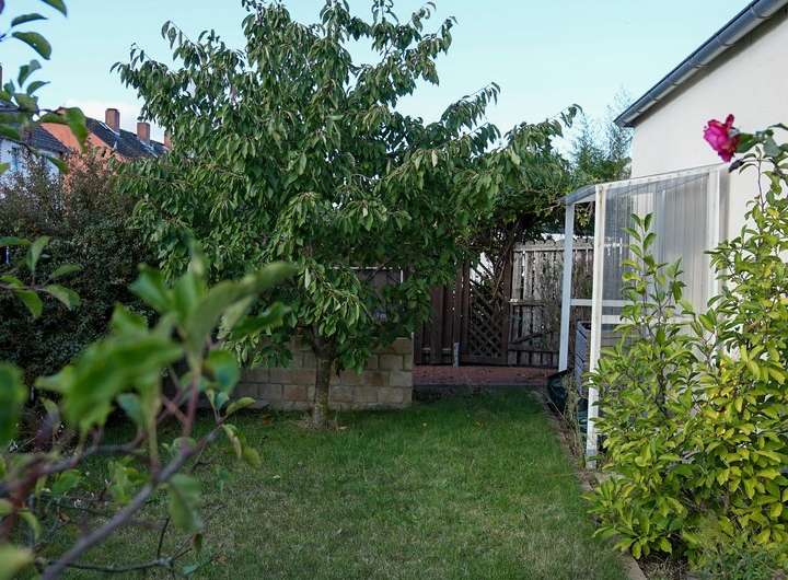 Über die, an Haus angrenzende Terrasse, gelangen Sie in einen weiteren massiven Abstellraum und in die Garage, welche genügend Platz für eine Werkstattecke bietet. Durch den Winkel des Hauses können Sie ungestört auf der Terrasse sitzen, dank der, im Frühjahr 2022 erneuerten Überdachung auch bei schlechterem Wetter. Eine weitere Terrasse liegt am anderen Ende des Gartens, wo auch ein Gartenhaus für ihre Gartengeräte bereitsteht. Der im Jahr 2020 erneuerte Sichtschutzzaun verfügt über eine Sitzbank mit integrierten Bepflanzungsmöglichkeiten. Beide Terrassen wurden im Jahr 2019 mit pflegeleichtem Altstadtpflaster neu angelegt. Da es sich um ein Reihenendhaus handelt, können sie sich über ein weiteres Stück Garten an der Westseite des Hauses freuen. Hier finden Sie einen Apfel-, sowie Kirschbaum und haben die Möglichkeit im Sommer ihre Wäsche zu trocknen. Wenn Sie Lust auf einen kleinen Naschgarten haben, können Sie sich über ein Hochbeet und einen Tomatenunterstand in diesem Teil des Gartens freuen. Außerdem ist hier bereits eine Bewässerung verlegt, welche über den eigenen Brunnen versorgt wird. Wenn Sie die Bewässerung erweitern wollen, sind hierfür schon alle Vorkehrungen getroffen.