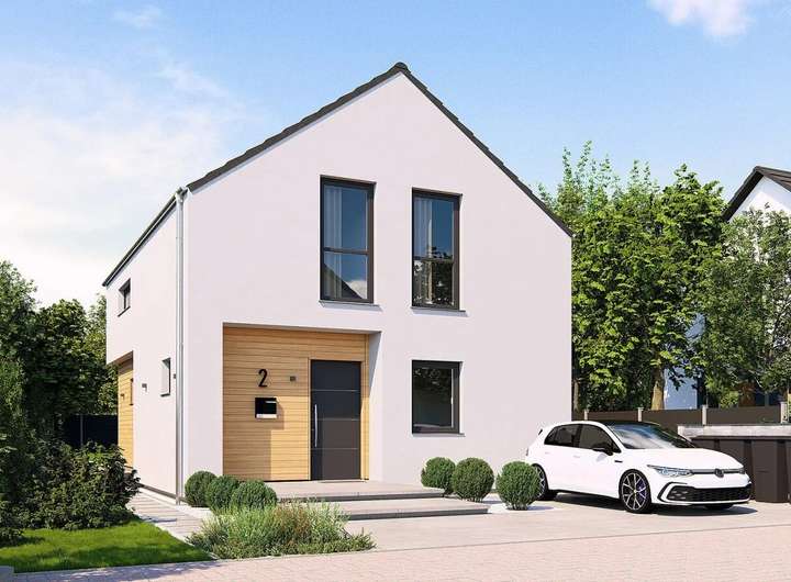 Schlichte Eleganz und ein durchdachtes Raumkonzept verleihen diesem Einfamilienhaus seine besondere Ausstrahlung. Die klare Linienführung der Architektur wird von einer zweifarbigen Fassadengestaltung betont, die Tiefe und Charakter schenkt. Im Inneren setzt sich diese Klarheit fort: Das Erdgeschoss öffnet sich zu einem lichtdurchfluteten Wohn-, Ess- und Kochbereich, der fließend in den Garten übergeht - ein Ort für lebendige Begegnungen und stille Augenblicke. Hauswirtschaftsraum und Gäste-WC sind dezent abgetrennt und sorgen für praktische Funktionalität. Von der großzügigen Diele führt eine Treppe ins Dachgeschoss, wo der Raum optimal genutzt ist: Ein helles Kinderzimmer, ein Elternschlafzimmer, ein Büro und ein komfortables Bad mit Wanne, Dusche und WC schaffen ein harmonisches Wohnumfeld. Auf rund 130 m² entsteht so ein Zuhause, das beständig Freude schenkt und Generationen verbindet.