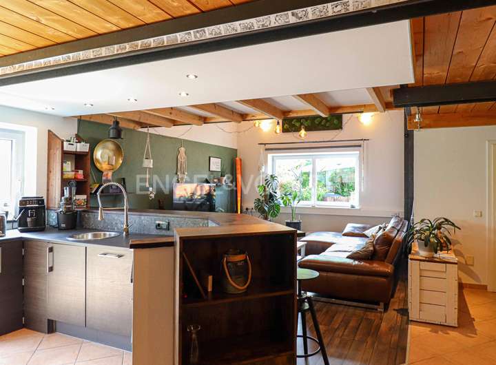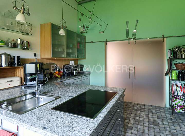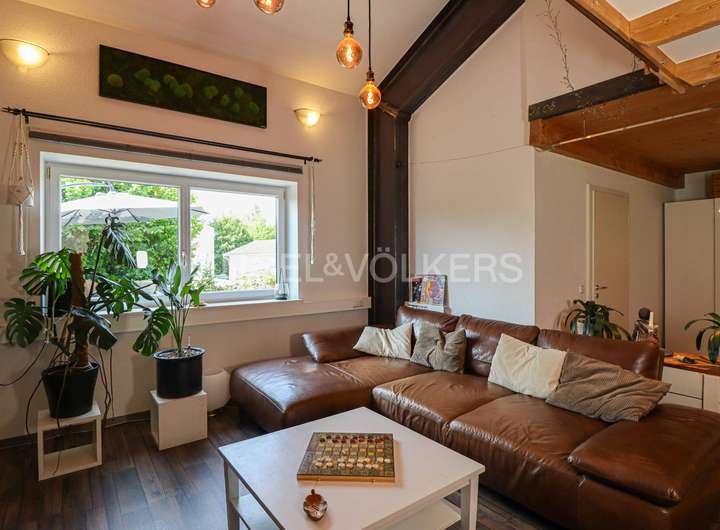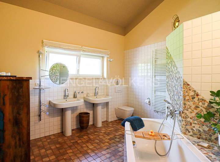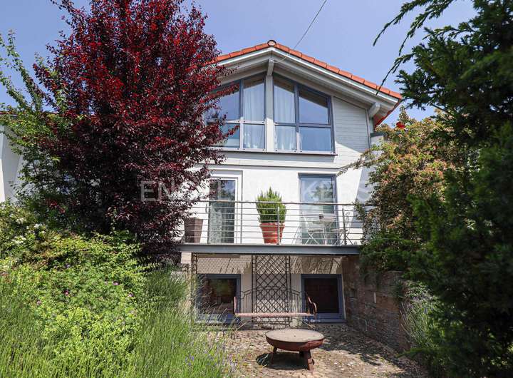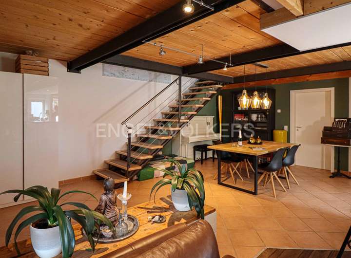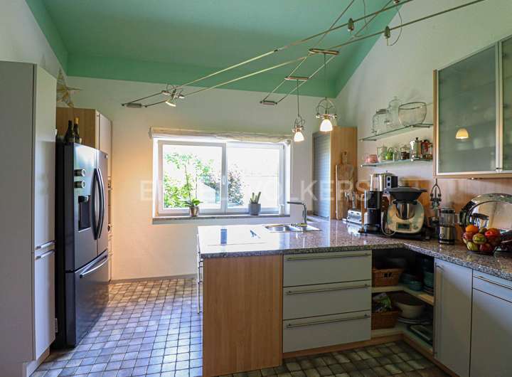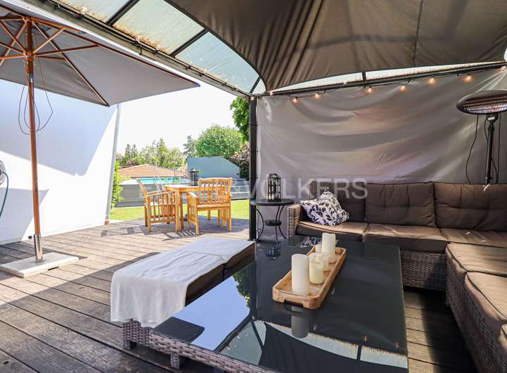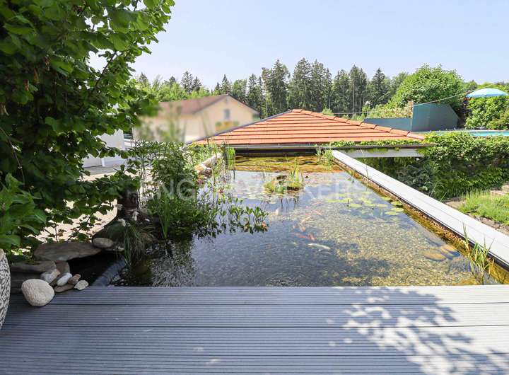 Das Haus besticht durch seine außergewöhnliche Innenarchitektur mit kluger Mischung aus Holz-, Stahl- und Betonelementen. Dachfenster, breite Fensterfronten, Galerien und Lufträume lassen die Räume hell und großzügig erstrahlen, lange Flure und Treppen ermöglichen einen geschmeidigen Übergang zwischen den Etagen der beiden autarken Wohneinheiten und der im Kern gelegenen Büro-/Praxiseinheit. Flexible Grundrisse und Maueröffnungen ermöglichen die Verbindung der Einheiten untereinander und eine variable Nutzung inklusive "Ganzjahres-Wohlfühl-Feeling": sonnige Terrassen mit gemütlichen Lounges und überdachtem Freisitz eingefasst von einem Außenpool und einem Zierteich-Biotop, verleihen der Immobilie eine individuelle Note. Natürlich darf ein Kaminofen für wohlige Stunden vor dem lodernden Feuer nicht fehlen.