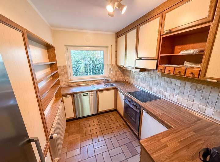 Auf der Ess-Ebene befindet sich auch die separate Küche mit Einbauküche. Über wenige Stufen gelangen Sie in den Wohnbereich mit direktem Zugang zur Terrasse und in den idyllischen Garten, der mit einem Gartenhaus und einem Feigenbaum zusätzliche Highlights bietet.