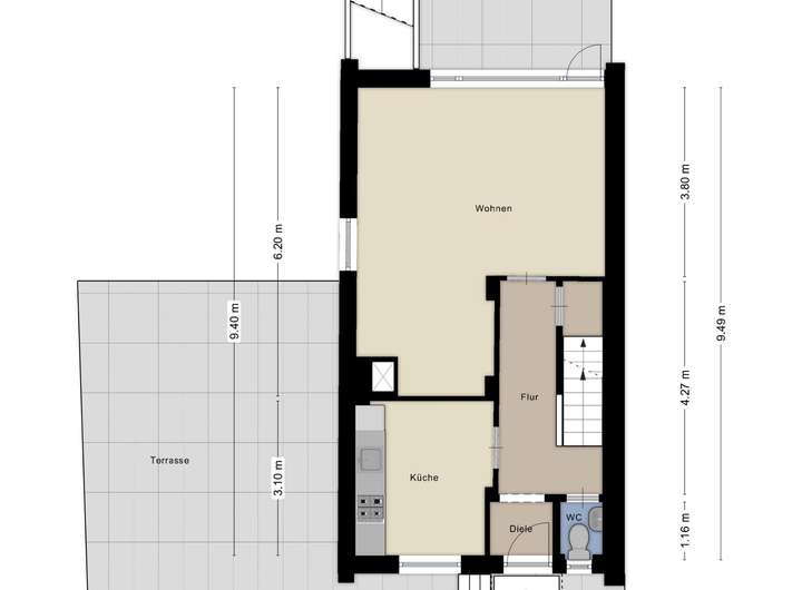 Erdgeschoss: Im Erdgeschoss befindet sich die Küche, welche sich durch das Entfernen einer Wand in den Wohn-Essbereich integrieren lässt. Vom Wohnzimmer aus gelangt man auf die Terrasse und weiter in den Garten. Zudem befindet sich hier auch das Gäste WC im Eingangsbereich.