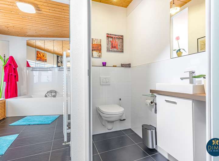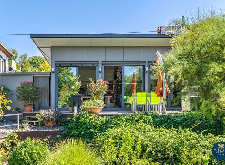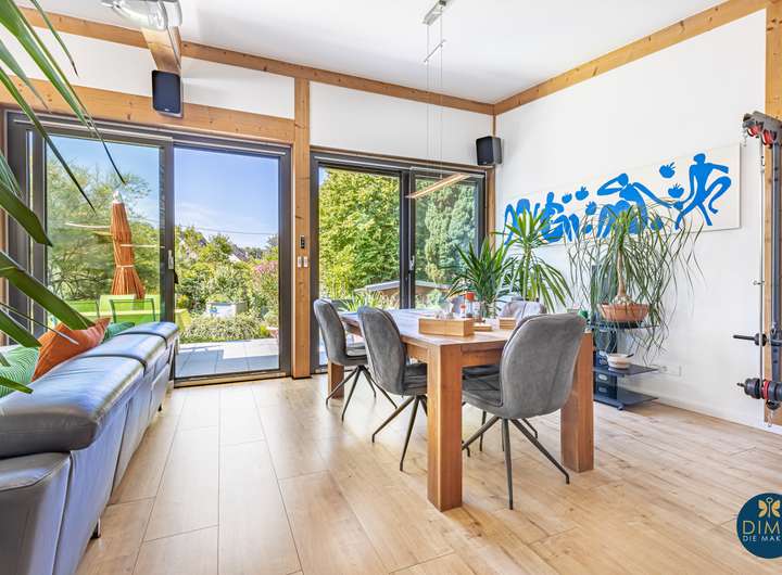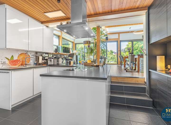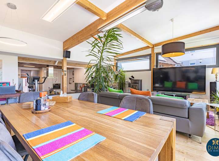 Heute präsentiert es sich mit loftartigem Charakter: Der lichtdurchflutete, offene Wohnbereich mit großen Fensterflächen, Kaminofen und moderner Küche schafft ein luftiges Raumgefühl. Das Tageslichtbad verfügt über Dusche und Badewanne, ergänzt durch ein separates WC. Im Außenbereich erwarten Sie eine Sonnenterrasse, ein Grillplatz, eine Holzhütte und eine Sauna.