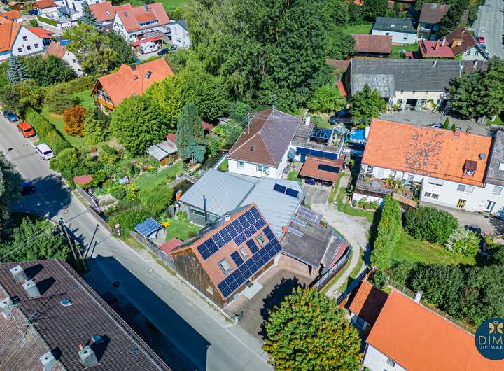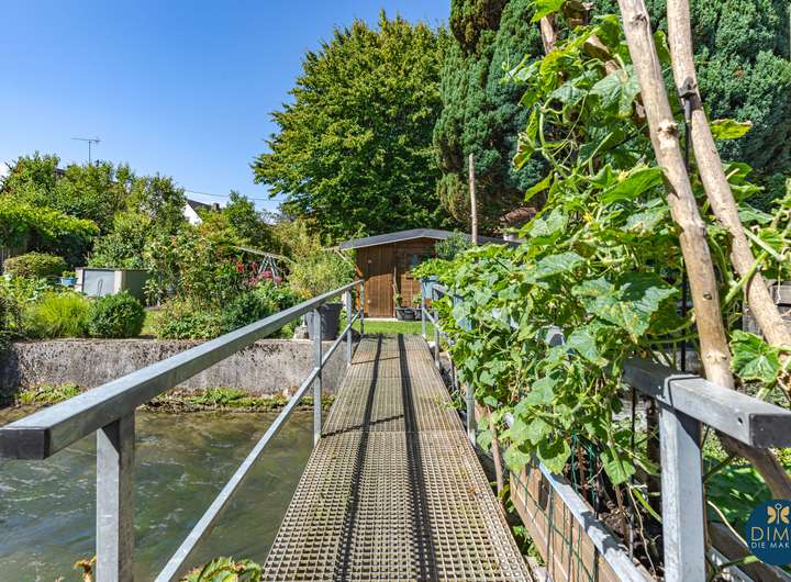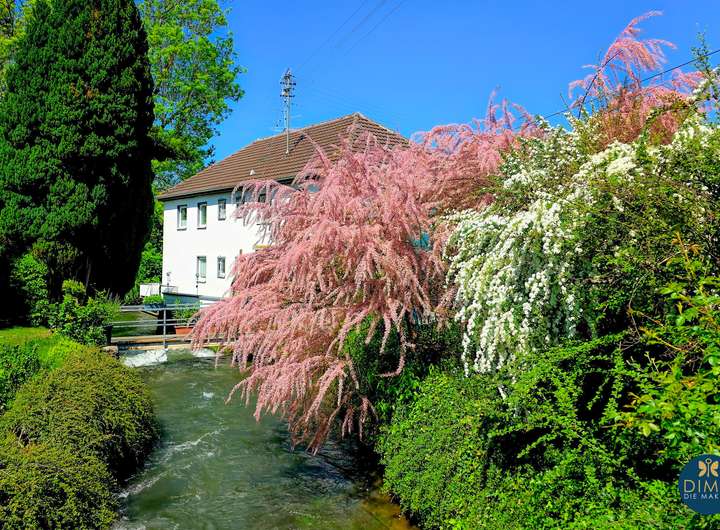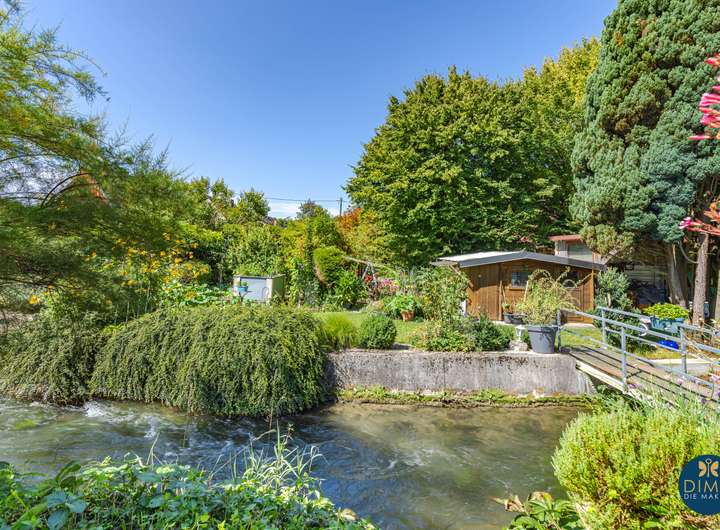 Dieses außergewöhnliche Ensemble vereint zwei eigenständige Wohnhäuser auf einem idyllischen Grundstück, durch das die Singold fließt. Über eine Brücke gelangt man auf eine kleine Insel, die dem Anwesen eine besondere Atmosphäre verleiht.