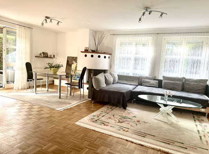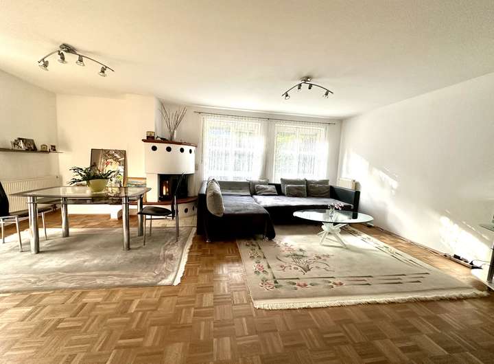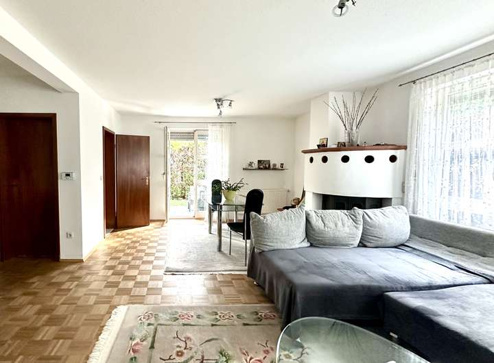 - Erdgeschoss: großzügiges Wohn- und Esszimmer mit Kamin, Küche, Gäste-WC, Zugang zur Terrasse und Garten