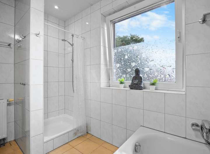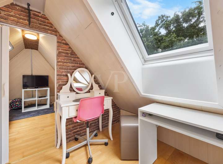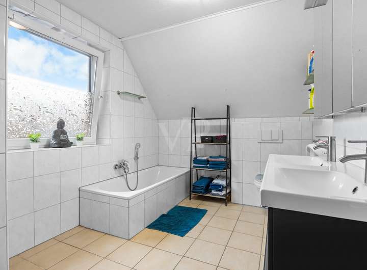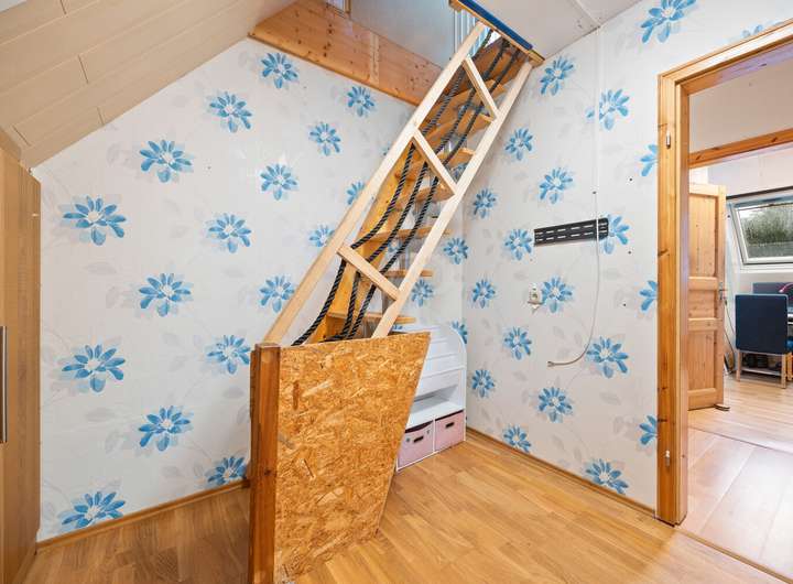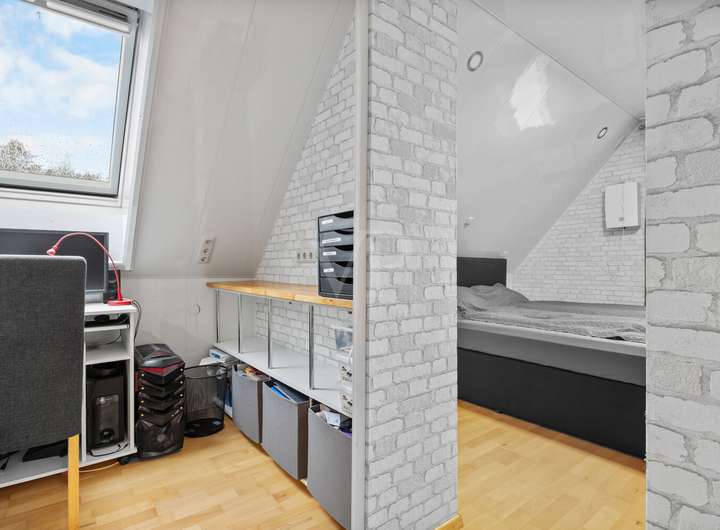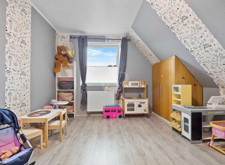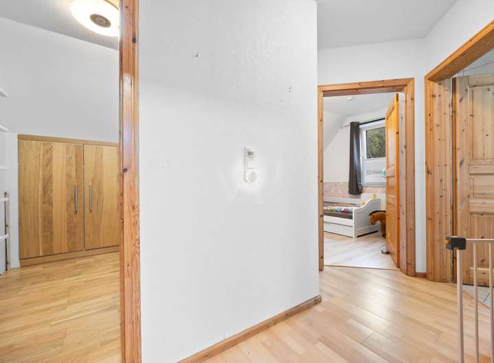 Über eine Holztreppe gelangen Sie ins Obergeschoss. Hier erwartet Sie ein Elternschlafzimmer mit integriertem Ankleidebereich und abgeteiltem Arbeitsplatz für das Homeoffice, ein Kinderzimmer mit Zugang in das ausgebaute Dachgeschoss, das aktuell als zusätzlicher Schlafbereich genutzt wird und über Fenster mit Rollläden sowie Heizung verfügt, sowie ein weiteres Zimmer, das als Kinder- oder Arbeitszimmer ideal ist. Ein großzügiges Bad mit Dusche und Wanne komplettiert die Etage.