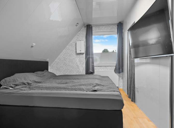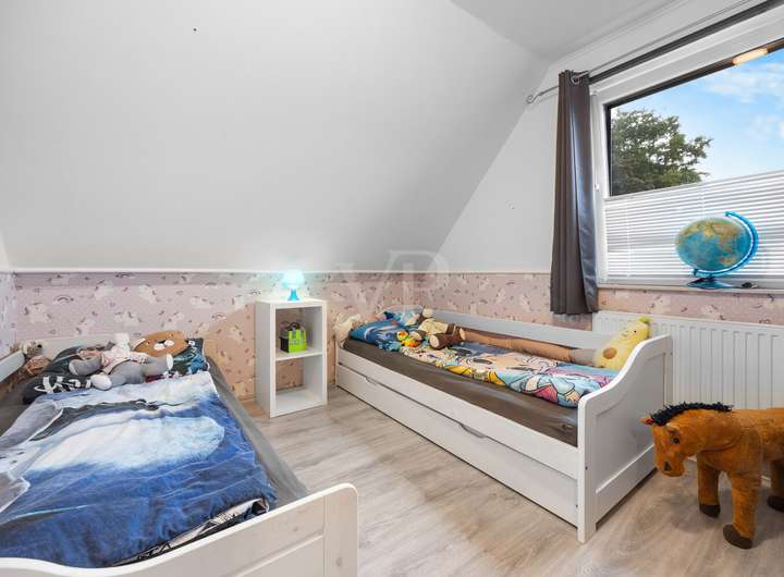 Insgesamt bietet das Haus vier Zimmer, davon drei als Schlafzimmer; der zusätzliche Schlafbereich im Dachgeschoss ist in der Zimmerzahl nicht enthalten und erweitert die Nutzungsspielräume der Familie.