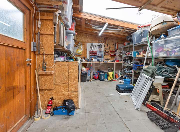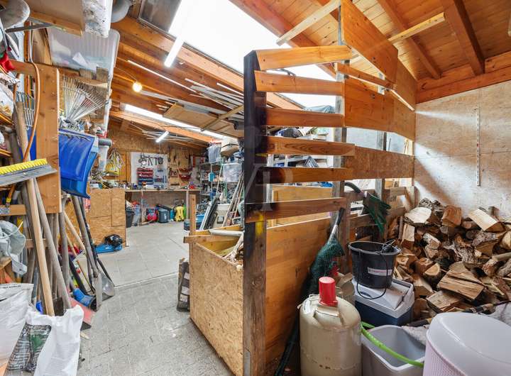 Praktisch für Alltag und Hobbys sind die Nebenflächen: Anstelle eines offenen Carports steht ein abgeschlossener Bereich zur Verfügung, der derzeit als Werkstatt und Fahrradschuppen genutzt wird. Eine gepflasterte Auffahrt bietet Platz für bis zu drei Pkw. Zusätzlich gibt es eine separate Blockhütte mit Stromanschluss. Zur Entwässerung wurde 2023 eine Drainage im Garten eingebracht.