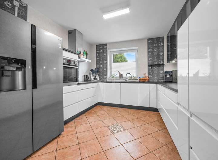 Der Eingang öffnet sich in eine großzügige Diele. Von hier geht es in den etwa 38 m² großen Wohn- und Essbereich mit Kamin, der das Haus an kühlen Tagen spürbar gemütlich macht. Die offen gestaltete Küche wurde 2022 erneuert, bleibt im Haus und ist im Angebot enthalten. Ebenfalls auf dieser Ebene: ein Gäste-WC sowie ein Hauswirtschaftsraum mit Anschlüssen für Waschmaschine und Trockner.