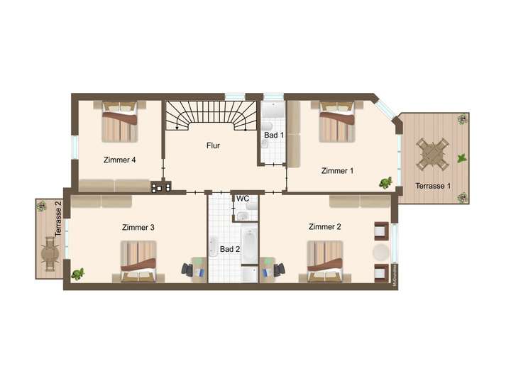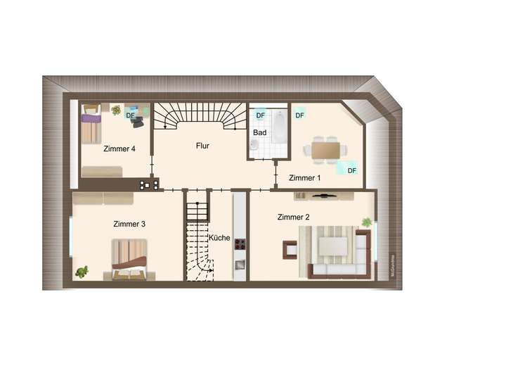 - 2. Obergeschoss mit 3 weiteren Zimmern, Küche und Badezimmer
