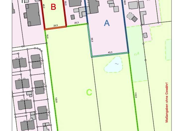 Das Grundstück ist in der Flurkarte mit den Kennzeichnungen B und C ersichtlich und steht ebenfalls zum Verkauf. Der Eigentümer macht ein attraktives Gesamtangebot für alle Grundstücke, sodass auch das Grundstück zwischen A und B erworben werden kann.