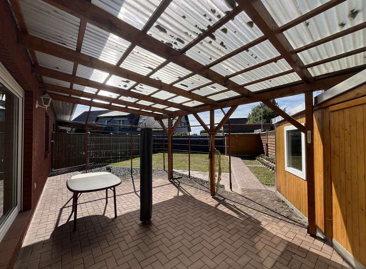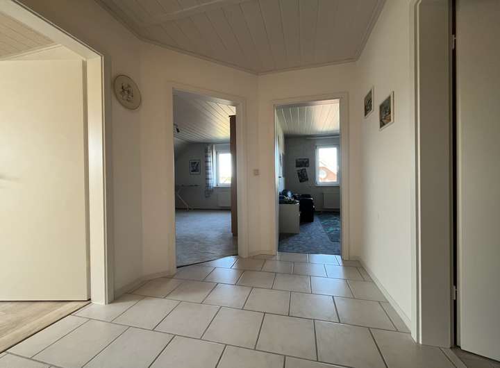 Im Erdgeschoss sorgt eine Fußbodenheizung – mit Ausnahme des Schlafzimmers – für angenehme Wärme und Komfort. Der helle Wohn- und Essbereich öffnet sich zur überdachten Terrasse, die zum Verweilen und Genießen einlädt. Am Hauseingang bietet ein überdachter Windfang zusätzlichen Schutz vor Wind und Wetter. Insgesamt stehen vier flexibel nutzbare Zimmer zur Verfügung, die sich ideal als Schlaf-, Kinder- oder Arbeitszimmer eignen.