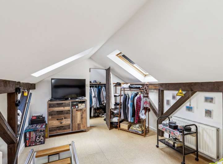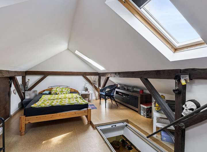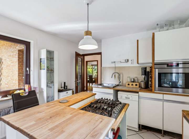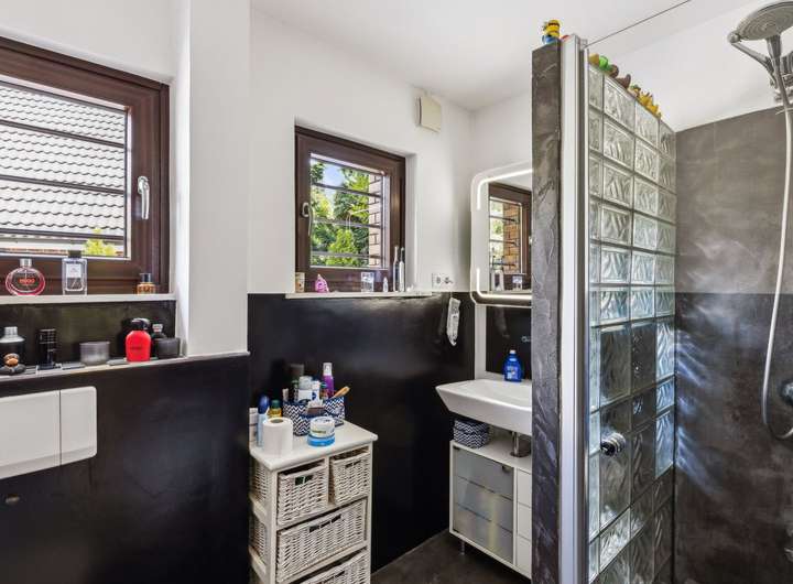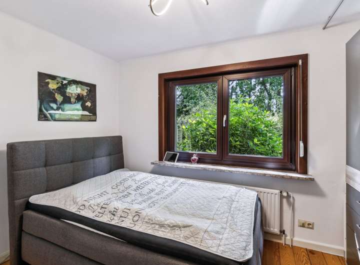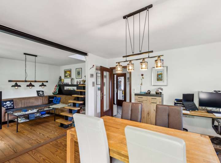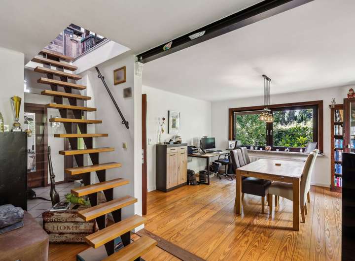 Das Haus wurde ca. 1955 auf einen ca. 635 m² großem ideell geteilten Südwest-Grundstück erbaut. Der Miteigentumsanteil beträgt lt. Teilungserklärung ½, die tatsächliche Nutzung ist größer. Der Garten ist schön eingewachsen, idyllisch angelegt und lässt mit seiner Größe genügend Platz zum Toben oder einfach zur Erholung. Die Holz-Terrasse lädt zum Verweilen ein. Die ca. 89 m² Wohnfläche des Hauses verteilen sich auf das Erdgeschoss und den ausgebauten Spitzboden. Sie betreten das Haus über einen kleinen Windfang und gelangen dann in die Diele, von der die Räumlichkeiten abgehen. Das Wohn-/Esszimmer ist mit schönem Parkettboden versehen und verfügt über einen gemütlichen Kaminofen, der in 2024 installiert wurde. Die Küche ist mit den üblichen technischen Geräten sowie einer Kochinsel ausgestattet und hat eine angenehme Größe - zudem wird hier mit Gas gekocht. Das Duschbad präsentiert sich modern, freundlich und wurde ca. 2014 erneuert - ein Fenster sorgt für die optimale Belüftung und Tageslicht. Ein weiteres Zimmer findet sich zudem im Erdgeschoss für die individuelle Nutzung. Über eine Spartreppe aus dem Wohnbereich gelangen Sie in den ausgebauten Spitzboden, dieser beherbergt ein weiteres Zimmer mit Ankleide. Der Vollkeller mit Außenzugang ist über die Küche zu erreichen und verfügt neben dem Heizungsraum noch über vier weitere Räume. Die genaue Raumaufteilung entnehmen Sie bitte den beigefügten Grundrissen. Die Beheizung erfolgt über eine Gas-Brennwertheizung aus dem Jahr 2023. Die Fenster sowie die Haustür wurden ca. 2011 ausgetauscht. Abgerundet wird dieses Angebot von einem Carport für Ihren PKW.