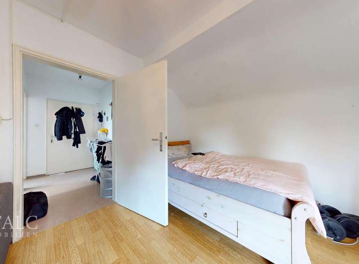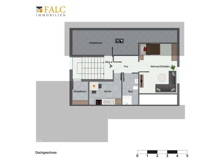 Das Dachgeschoss beherbergt eine weitere kleine Wohneinheit (Whg 4, 1-Zi. Whg mit Küche und Bad). Hier finden Sie ein großzügiges Wohn- und Schlafzimmer sowie ein zweckmäßiges Bad.