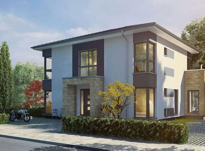 Die Stadtvilla mit Walmdach erstrahlt in nobler Eleganz. Die Grau- und Sandsteinelemente fügen sich harmonisch ins Gesamtbild ein.