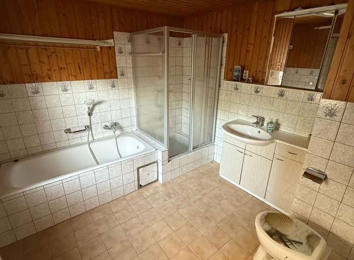 Bei dem Objekt handelt es sich um ein ca. 170 m² großes Einfamilienhaus mit acht Zimmern, einem Bad, einem WC, Keller, Terrasse und Küche. Die Sanierung stammt zum größten Teil aus den 90ern. Somit ist das Objekt z.B. für eine Familie nach einer Renovierung sofort bewohnbar. Ungefähr dreiviertel aller Fenster wurden bereits 2003 erneuert. Die Heizung stammt aus dem Jahr 1991,