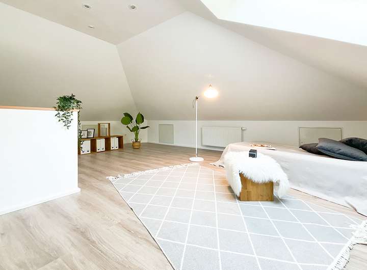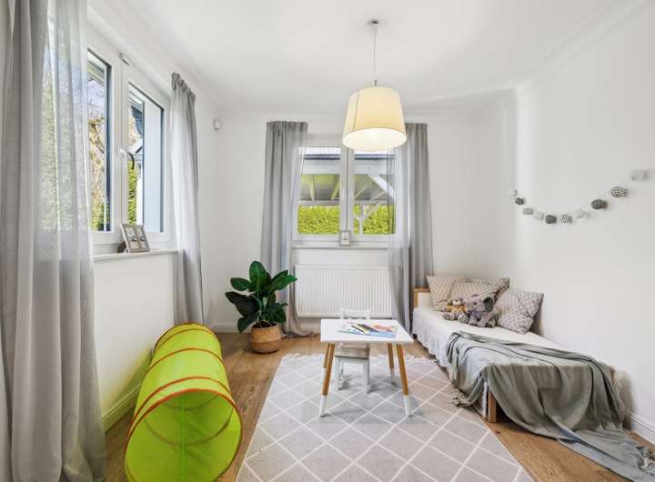 Drei zusätzliche Zimmer können individuell als Schlafzimmer, Arbeitszimmer oder Kinderzimmer genutzt werden. Eine innenliegende Treppe führt in einem der Zimmer in das 2024 ausgebaute Dachgeschoss mit ca. 49 m² Nutzfläche. Dieser Bereich eignet sich hervorragend als Büro oder Hobbyraum. Ein abgetrennter Bereich dient als praktischer Stauraum.