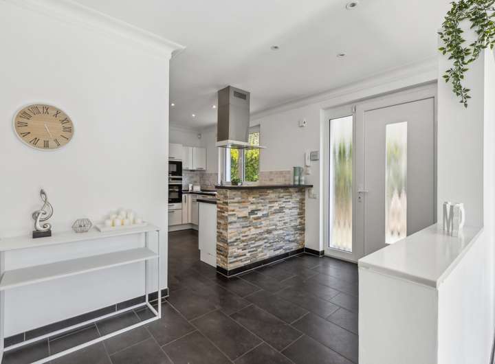 Die offene Küche ist mit modernen Elektrogeräten namhafter Hersteller und einer hochwertigen Einbauküche ausgestattet, ideal für gemeinsame Kochabende. Ein direkt angrenzender Hauswirtschaftsraum mit Waschmaschinenanschluss sorgt für zusätzlichen Komfort und bietet einen Zugang zum Carport und Schuppen, sodass die Einkäufe trocken ins Haus gebracht werden können.