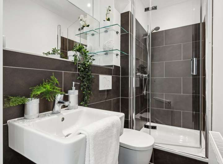 Über den Flur erreichen Sie rechter Hand das Gäste-Duschbad. Das dahinterliegende Hauptbadezimmer ist modern und hochwertig ausgestattet und bietet eine geräumige Dusche, eine Badewanne, ein Doppelwaschbecken und Tageslicht.