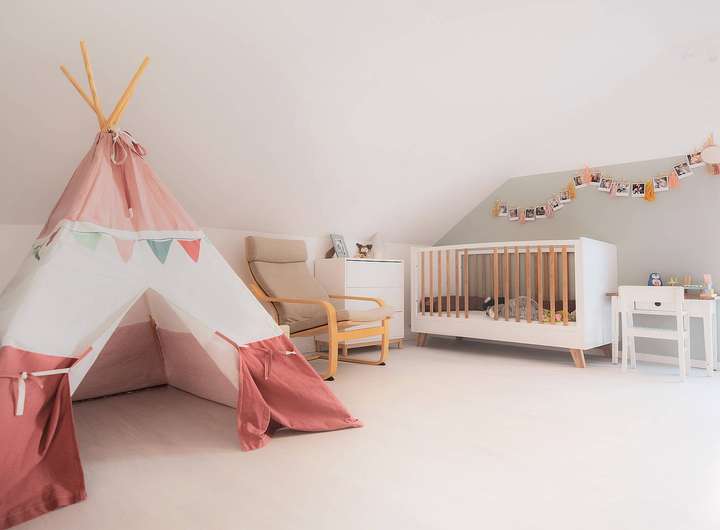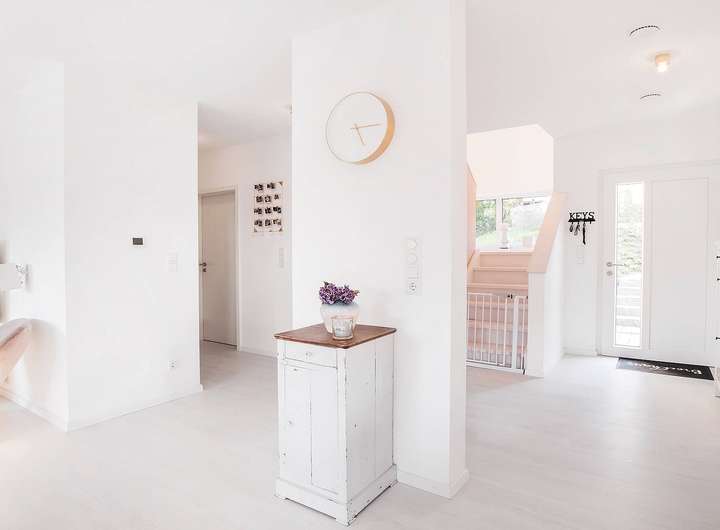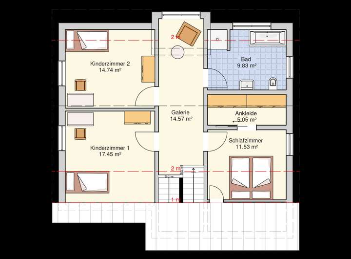 Eine elegante, keilgezinkte Holztreppe führt Sie ins Obergeschoss, wo Sie eine helle Galerie erwartet. Hier befinden sich ein großzügiges Elternschlafzimmer mit integriertem Ankleidezimmer sowie zwei geräumige Kinderzimmer. Das Badezimmer bietet eine große Badewanne und eine separate Dusche, perfekt für erholsame Stunden. Besonders hervorzuheben ist der Flachdach-Erker, der sowohl Licht als auch zusätzlichen Raum ins obere Bad und zur Terrasse bringt.