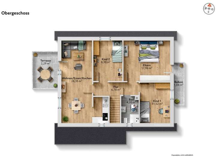 - Obergeschoss: 4-Zimmer, Küche, Bad, große Terrasse, Balkon