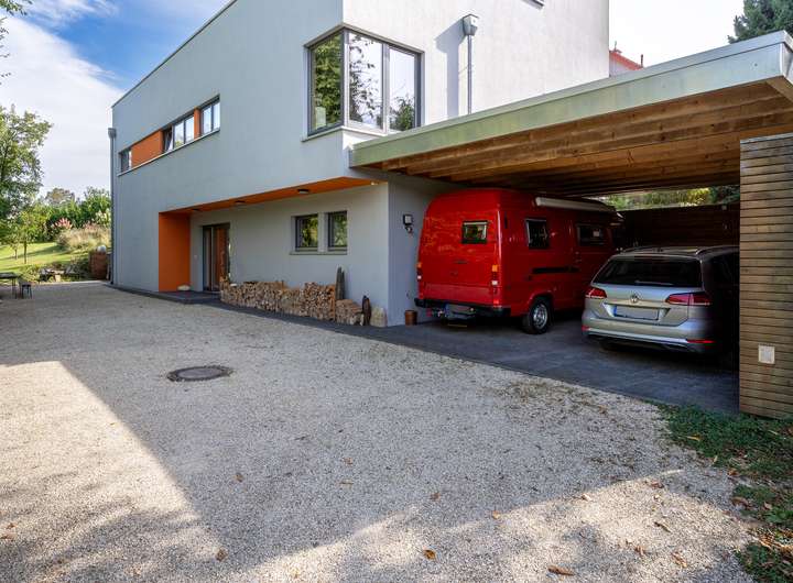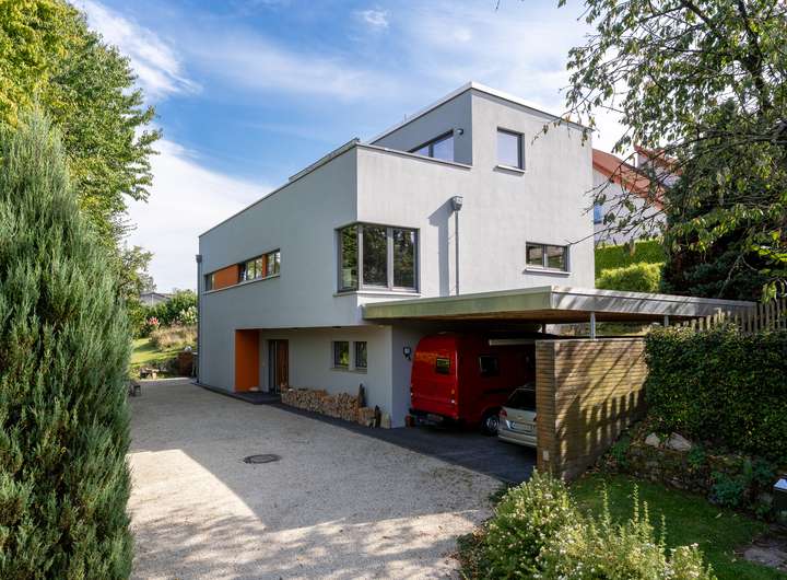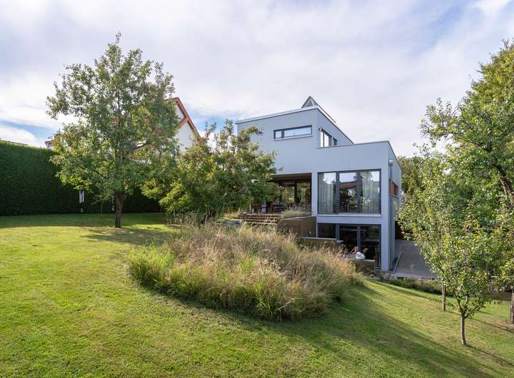 Die Außenflächen sind gestaltet mit naturnahem Garten, Terrassenebenen und Pflanzflächen, die den Hang betonen. Ein Ort zum Sein, für Ruhe, Blick und Natur – aber mit der Nähe zur Stadt und Infrastruktur, die man schätzt.