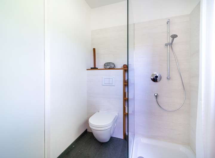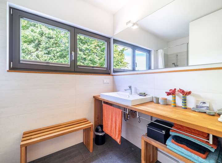 Der offen gestaltete Wohn- und Essbereich beeindruckt durch Großzügigkeit und Helligkeit – Panoramafenster holen die Natur ins Haus und lassen Wohnräume und Außenbereich miteinander verschmelzen. Angrenzend finden sich bewusst Rückzugsorte: ein Büro und ein Gästezimmer, gleichzeitig flexibel nutzbar. Abgerundet wird die Ebene durch ein Badezimmer mit bodentiefer Dusche.