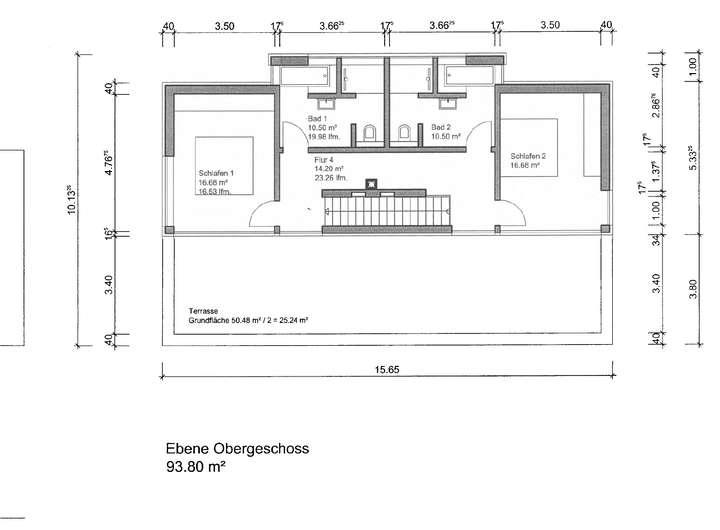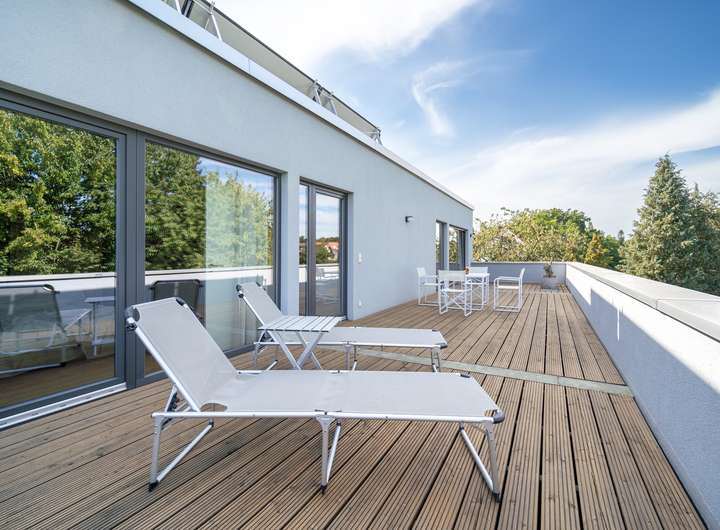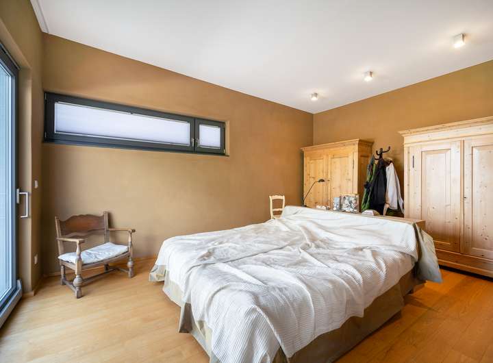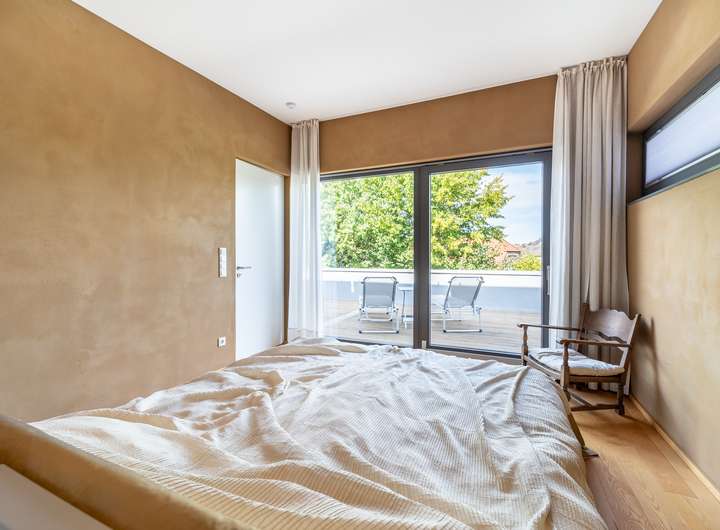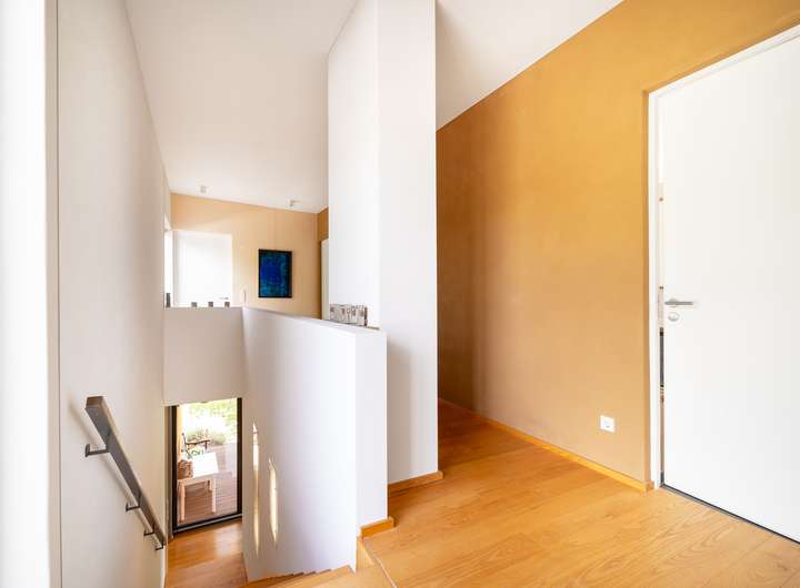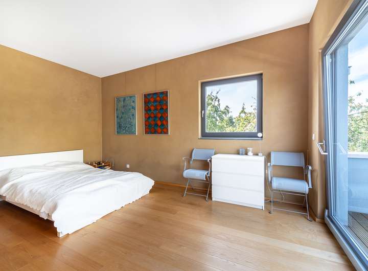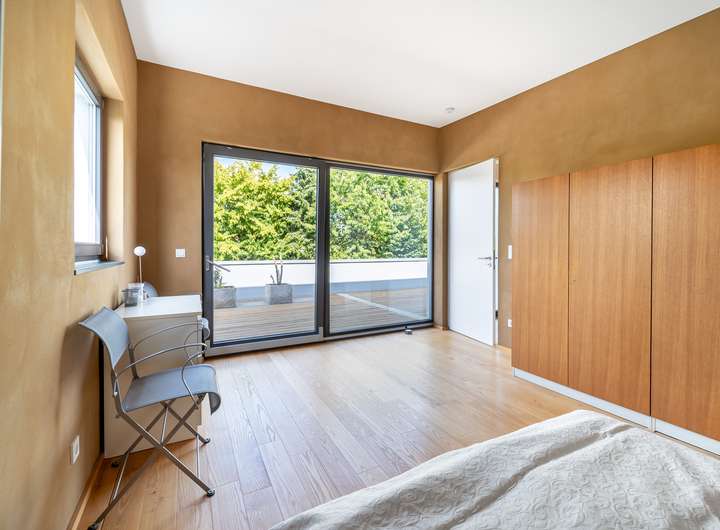 Die private Ebene – im Obergeschoss – mit zwei Schlafräumen und zwei Badezimmern ist bewusst ruhig gehalten und schafft Rückzugsorte für die ganze Familie. Flexibel nutzbare Räume ermöglichen die perfekte Balance aus Gemeinsamkeit und individueller Freiheit. Krönung des baurechtlich eingeschossigen (!) Traumhauses: die Dachterrasse mit einer Grundfläche von circa 50 m².