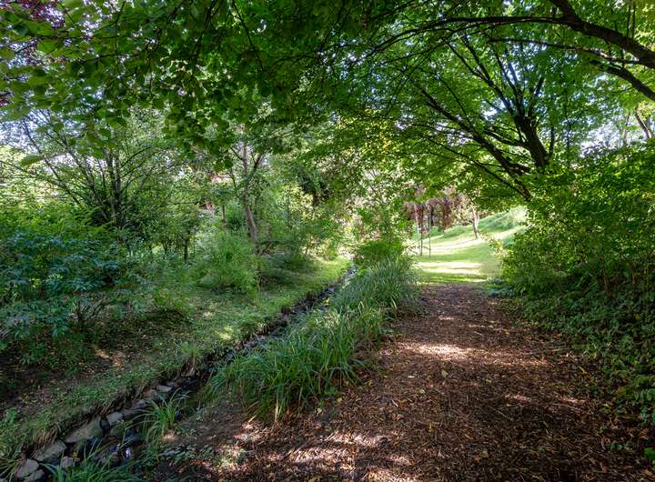 Ein eigener Bachlauf verläuft am Hang und spendet leise, sinnliche Geräusche – ein Naturdetail, das deutlich spürbar wird. Auf Terrassen und Freiflächen genießt man Privatsphäre, Sonnenlicht und Wassernähe in Einklang.