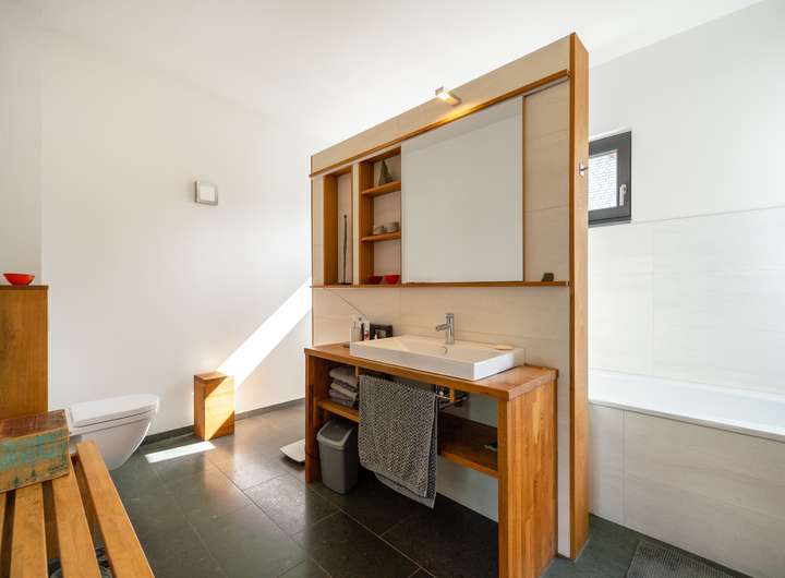 - Die Bauweise nach KfW-55 Standard garantiert niedrige Energiekosten und ein gesundes Raumklima.
