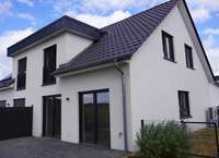 Freuen Sie sich auf Ihr neues Zuhause in ruhiger Feldrandlage mit ca. 348 m² Grundstück und herrlichem Weitblick. Die moderne Putzfassade der Doppelhaushälfte, in Verbindung mit anthrazitfarbenen Fenstern und Haustür trifft mit Sicherheit Ihren Geschmack. Der gut strukturierte Grundriss bietet Ihnen Wohnkomfort auf ca. 102 m² Wohnfläche. Die offene Bauweise von Küche, Wohn- und Essbereich vermittelt ein wunderbares Wohlgefühl von Freiraum. Heizung, Waschmaschine und Vorrat erhalten ihren Platz im Hauswirtschaftsraum. Außerdem stehen Ihnen auf dieser Ebene noch ein Gäste-WC und eine Garderobennische zur Verfügung. Im Obergeschoss empfangen Sie drei Räume, die darauf warten als Schlaf-, Kinder- oder Gästezimmer bewohnt zu werden, oder soll doch noch ein Ankleidezimmer her? Das Badezimmer punktet mit einer bodengleichen Dusche, einer Badewanne und mit einer modernen, großen Flachdachgaube, die für viel Tageslicht sorgt.