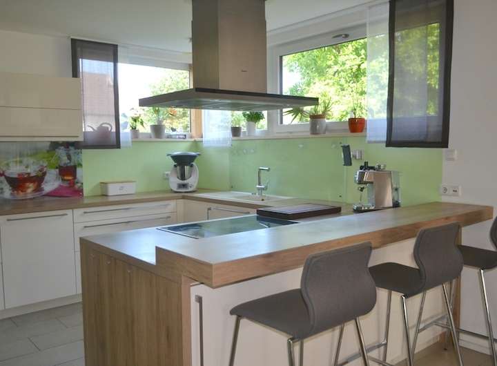 hochwertige, große, helle Küche mit Tresen