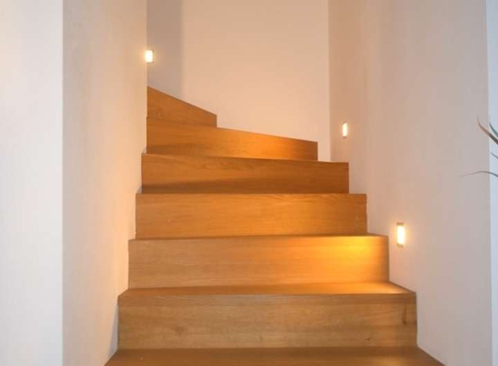 beleuchtete Massivholz-Treppe ins OG