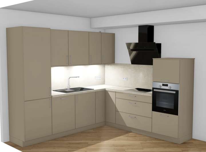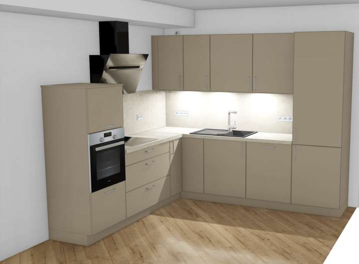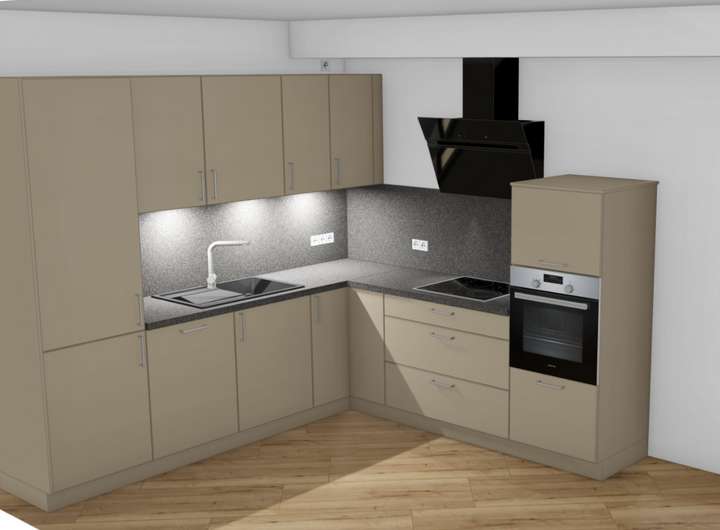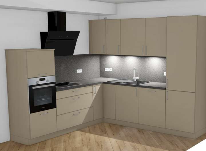 - Einbauküche: In einem modernen hellgrauen Design, funktional und optisch ansprechend geplant.
