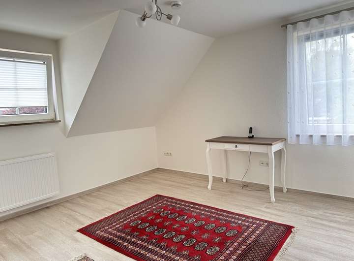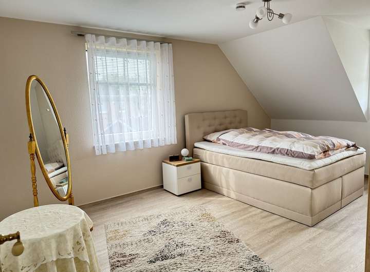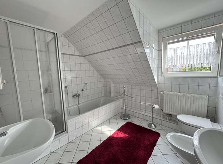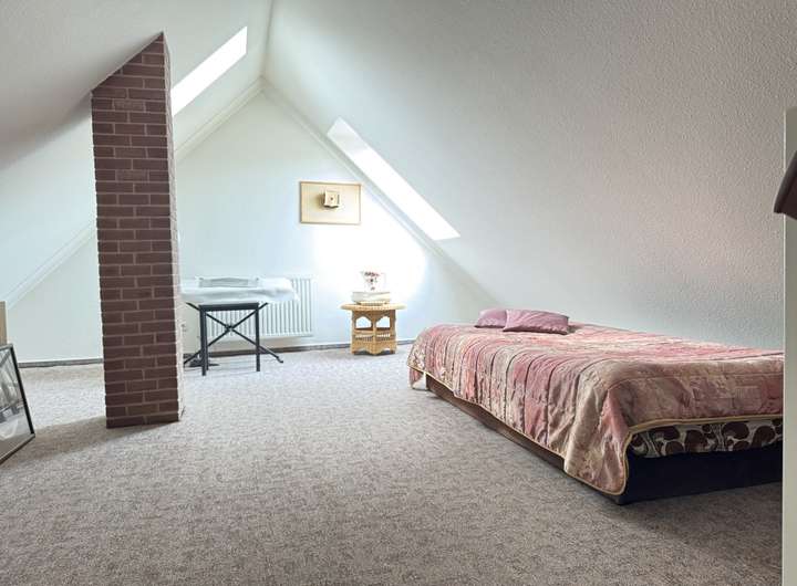Das Obergeschoss wurde erst kürzlich umfassend renoviert – sowohl die Böden mit hellem Vinyl als auch die Wände wurden modernisiert. Hier befinden sich drei Schlafzimmer sowie ein großzügiges Tageslichtbad mit Badewanne, Dusche und Doppelwaschbecken. Zwei charmante Gauben sorgen für zusätzliche Raumhöhe und ein angenehmes Wohngefühl.