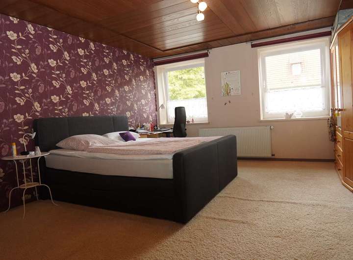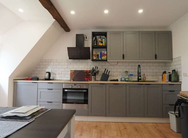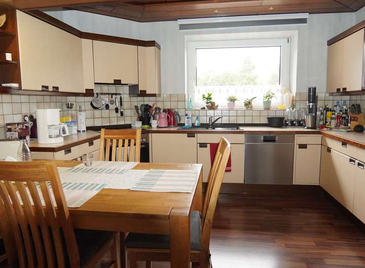 Über eine historische Holztreppe erreicht man die Wohnungen. Im 1. Obergeschoss befindet sich eine großzügige 4-Zimmer-Wohnung. Vom Eingangsflur mit praktischem, eingebautem Garderobenschrank gelangt man in den lichtdurchfluteten Wohn- und Essbereich, das Wannenbad mit Dusche und Fenster, sowie ein komfortables Schlafzimmer. Ein weiteres Zimmer bietet sich flexibel als Kinderzimmer, Arbeits- oder Homeoffice-Zimmer an. Herzstück der Wohnung ist die großzügige Küche mit angrenzendem Esszimmer, die viel Raum für gemeinsames Kochen und geselliges Beisammensein schafft.
